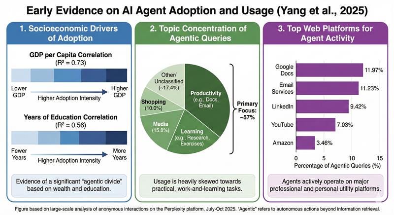 The “Agentic Divide”: Adoption is not democratized; it tracks closely with socioeconomic status. Usage intensity correlates strongly with GDP per capita ($r=0.85$) and education levels ($r=0.75$). The user base is dominated by knowledge-intensive sectors like Digital Technology (28% of adopters), Finance, and Academia.