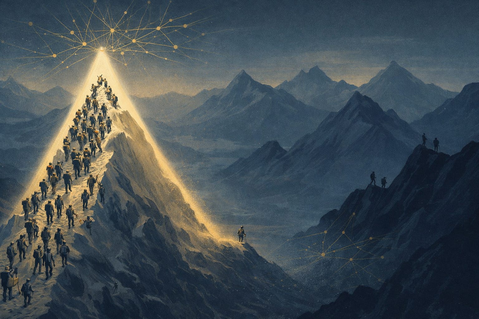A narrower search pattern risks science getting stuck on “local maxima”: lots of progress on today’s benchmarks, less exploration of alternative questions and methods.